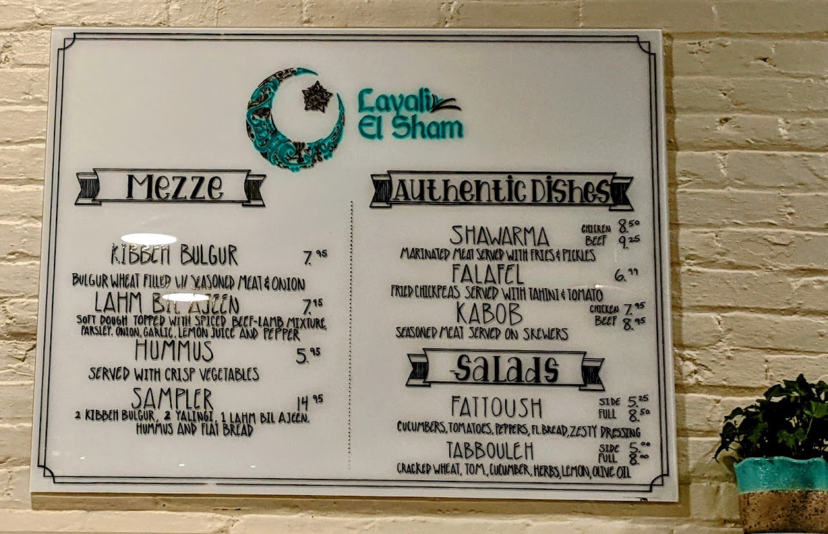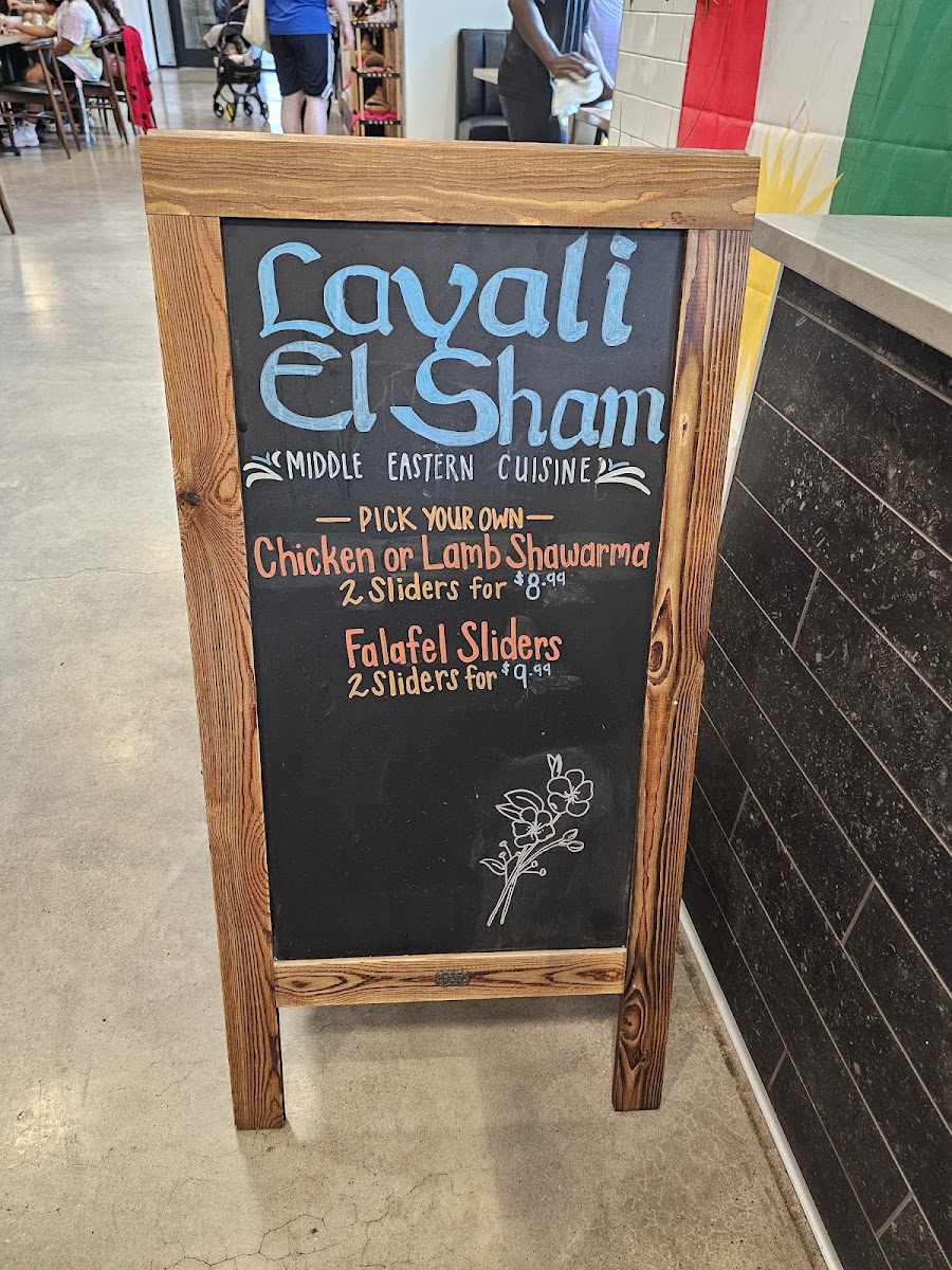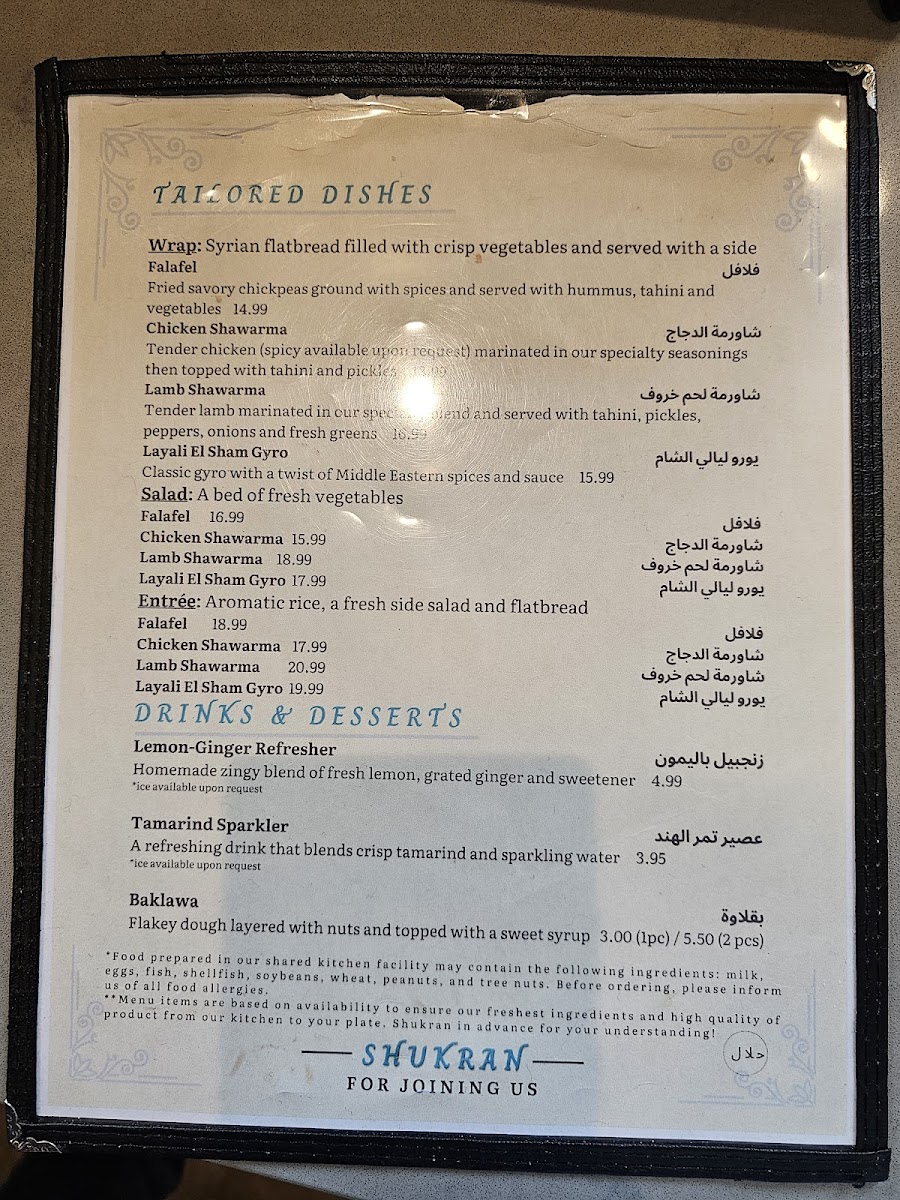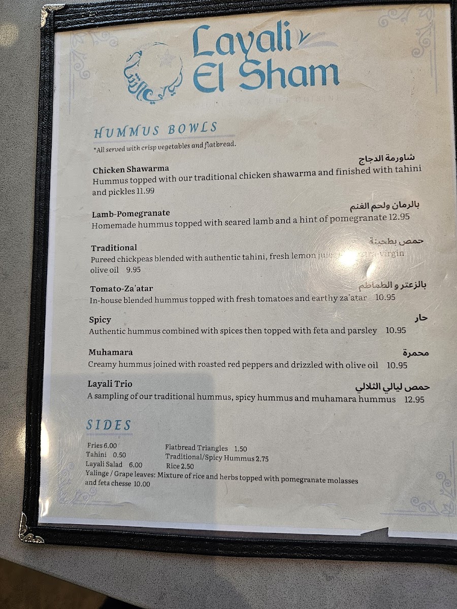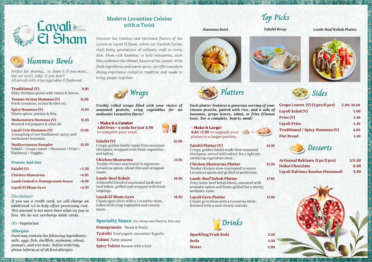 The menu at Layali El Sham offers a delightful variety of Middle Eastern dishes with something for everyone. The Hummus Bowls are a standout, featuring options like the traditional hummus, Tomato Za'atar Hummus, Spicy Hummus, and Muhammara Hummus. For a more diverse experience, the Layali Trio Hummus combines multiple flavors in one bowl. You can enhance your dish with protein add-ons such as Falafel, Chicken Shawarma, Lamb Coated in Pomegranate Sauce, or the Layali El Sham Gyro. The Wraps menu includes favorites like Falafel, Chicken Shawarma, Lamb-Beef Kebab, and the signature Layali El Sham Gyro. For heartier meals, the Platters provide larger portions, such as the Falafel Platter, Chicken Shawarma Platter, Lamb-Beef Kebab Platter, and the delicious Layali Gyro Platter. If you're craving something on the side, try the Grape Leaves (3 pcs), Layali Salad, or Fries. The Layali Fries and Traditional / Spicy Hummus make for great complements. For dessert, the Artisanal Baklawa and the indulgent Layali Baklawa Sundae (seasonal) offer a sweet ending to your meal. The restaurant also serves refreshing drinks like Sparkling Fruit Soda, Soda, and Water to quench your thirst. Don’t forget to add some flavor with specialty sauces, including Pomegranate, Tzatziki, Tahini, and Spicy Tahini. Whether you're enjoying a casual wrap or a hearty platter, Layali El Sham’s menu delivers authentic and flavorful dishes that promise a satisfying dining experience.