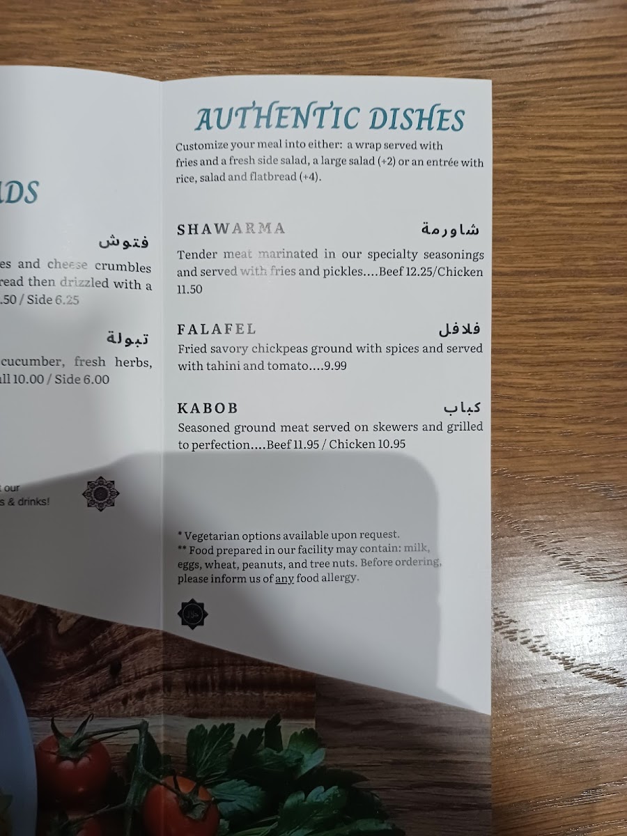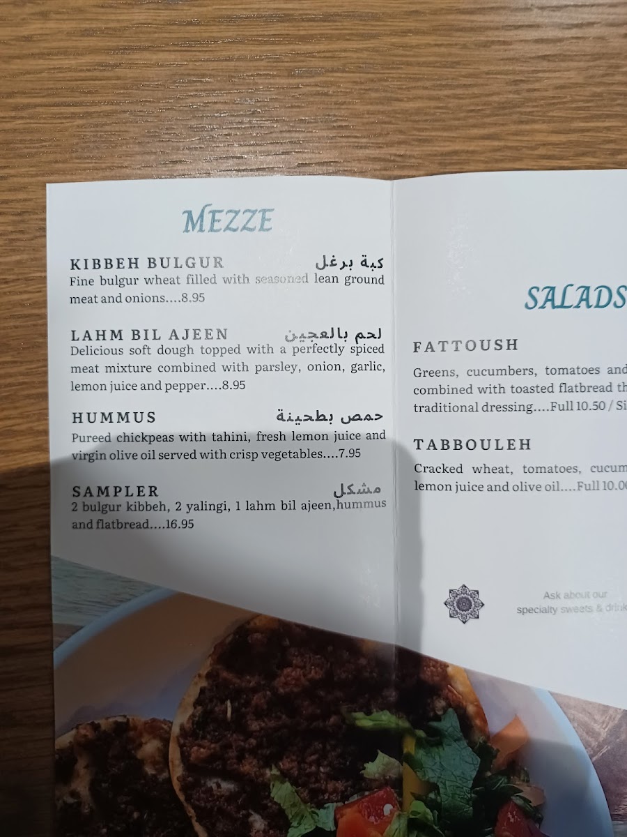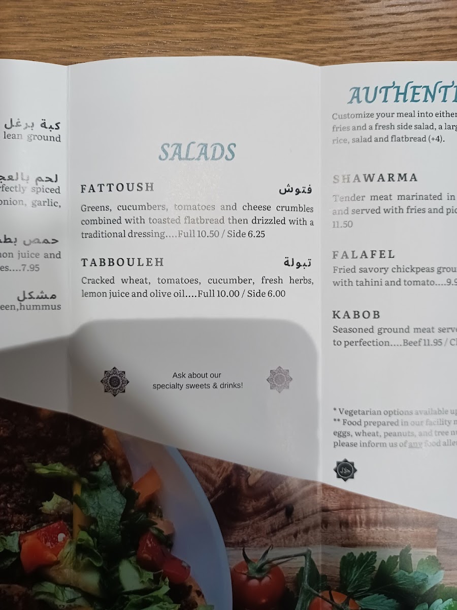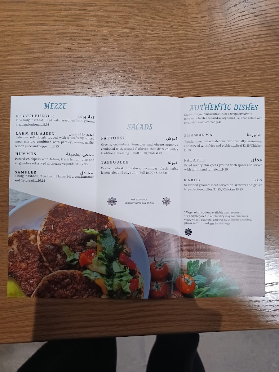 The menu at Layali El Sham offers a delightful variety of Middle Eastern dishes with something for everyone. The Hummus Bowls are a standout, featuring options like the traditional hummus, Tomato Za'atar Hummus, Spicy Hummus, and Muhammara Hummus. For a more diverse experience, the Layali Trio Hummus combines multiple flavors in one bowl. You can enhance your dish with protein add-ons such as Falafel, Chicken Shawarma, Lamb Coated in Pomegranate Sauce, or the Layali El Sham Gyro. The Wraps menu includes favorites like Falafel, Chicken Shawarma, Lamb-Beef Kebab, and the signature Layali El Sham Gyro. For heartier meals, the Platters provide larger portions, such as the Falafel Platter, Chicken Shawarma Platter, Lamb-Beef Kebab Platter, and the delicious Layali Gyro Platter. If you're craving something on the side, try the Grape Leaves (3 pcs), Layali Salad, or Fries. The Layali Fries and Traditional / Spicy Hummus make for great complements. For dessert, the Artisanal Baklawa and the indulgent Layali Baklawa Sundae (seasonal) offer a sweet ending to your meal. The restaurant also serves refreshing drinks like Sparkling Fruit Soda, Soda, and Water to quench your thirst. Don’t forget to add some flavor with specialty sauces, including Pomegranate, Tzatziki, Tahini, and Spicy Tahini. Whether you're enjoying a casual wrap or a hearty platter, Layali El Sham’s menu delivers authentic and flavorful dishes that promise a satisfying dining experience.